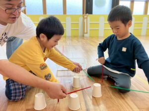 お友だちと頑張って協力し取り組む活動です。年齢が大きい子になると「次、何番だからこれだよ」と率先して声をかけて行う姿も見られました。