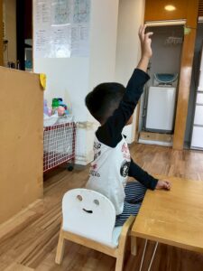 質問に対しても積極的に挙手し答えることができており、実践では職員の指示を聞き、ホール中央に集まり頭を守ること、自分に身体を守ることができています。