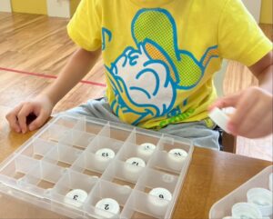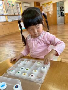 実際に行ってみて、子どもたちはとても集中し取り組んでいいました。また、数字を読み上げたり、これは〇〇だねと絵をみて、シールの文字を読んでみたりと言葉にし行っていました。全てのマスが埋まると「できた!!」と達成感にも繋がっていました☺