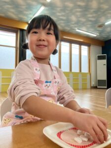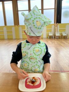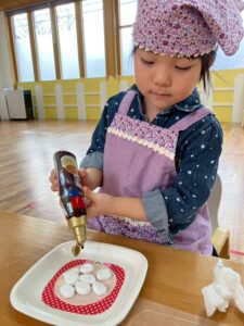 美味しそうとマシュマロを味見したい気持ちをぐっとこらえトッピングしていました☺