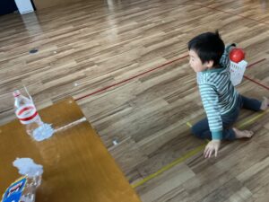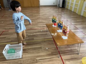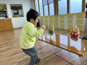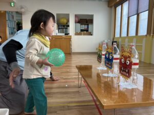 2月3日はボールを投げてペットボトルに付けた鬼を退治する活動を行いました。